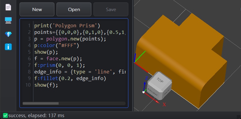 box.new(10, 10, 10):fillet(2, {type = "line", min = {-1, -1, -1}, max = {11, 11, 1}}):show()倒角(Chamfer)